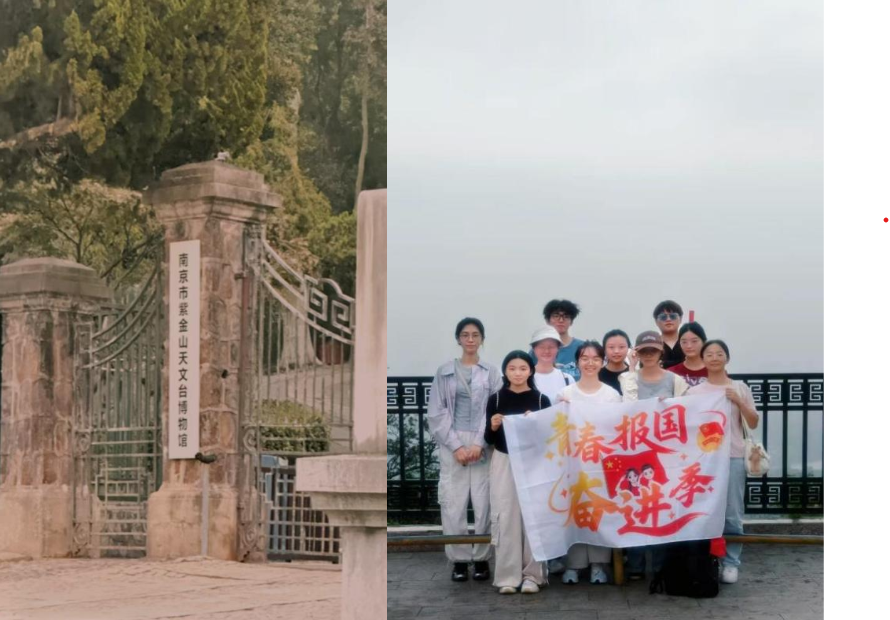 17时30分,随着攀登不断深入,紫金山天文台逐渐出现在视野中。这座见证中国天文事业发展的建筑,让团员们心生向往。大家沿着台阶走上观景台,抬手拂去肩头薄霜般的雾水,一同俯瞰山下景致:南京城的轮廓在浓雾中晕染,玄武湖的波光藏于雾里,远处高楼剪影隐约可见,宛若一幅流动的水墨画卷。团员们当即决定在此合影,活动标志旗在雾里透出鲜亮的红色,大家笑着并肩而立,定格下这张满含“烟火气与理想感”的集体瞬间。